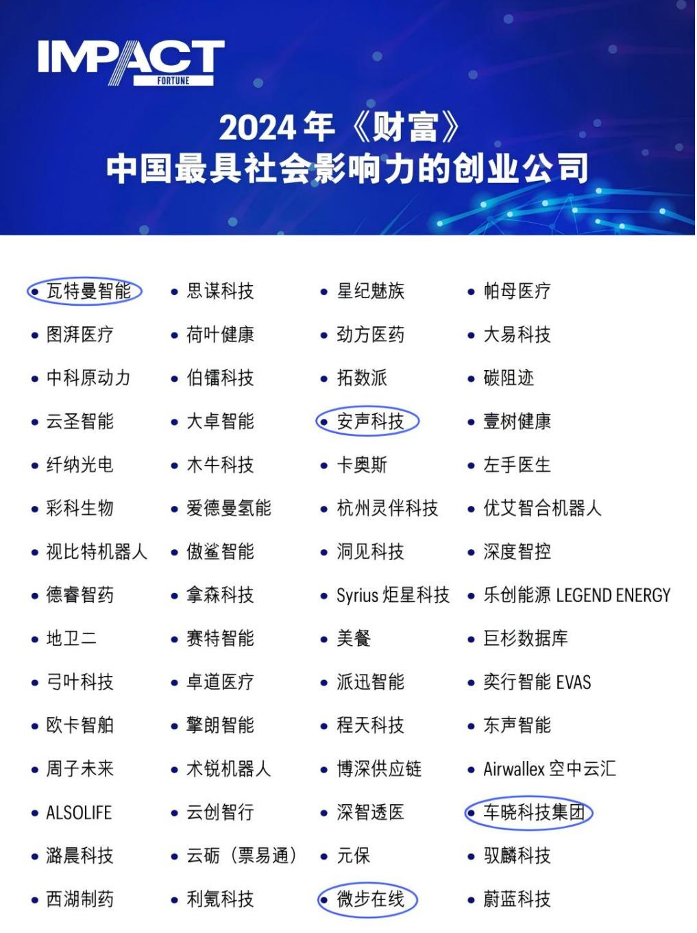 近日,全球著名商業(yè)雜志《財(cái)富》(Fortune Magazine)發(fā)布“2024年中國(guó)最具社會(huì)影響力的創(chuàng)業(yè)公司”榜單。創(chuàng)投集團(tuán)4家被投企業(yè)成功上榜,包括:瓦特曼智能、安聲科技、微步在線和車曉科技。