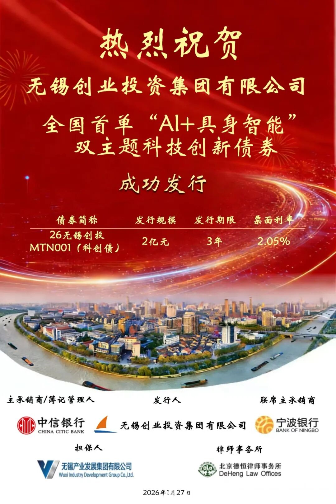 1月27日,全國首單同時(shí)聚焦“人工智能”與“具身智能”的主題科技創(chuàng)新債券在錫發(fā)行。無錫創(chuàng)業(yè)投資集團(tuán)有限公司成功發(fā)行2026年第一期中期票據(jù),規(guī)模2億元,集中投向人工智能與具身智能賽道。這是繼去年成功發(fā)行全國首批科技創(chuàng)新債券后,創(chuàng)投集團(tuán)再次運(yùn)用金融創(chuàng)新工具,精準(zhǔn)引導(dǎo)社會(huì)資本投向科技前沿,為無錫乃至長三角地區(qū)關(guān)聯(lián)產(chǎn)業(yè)發(fā)展注入動(dòng)能。